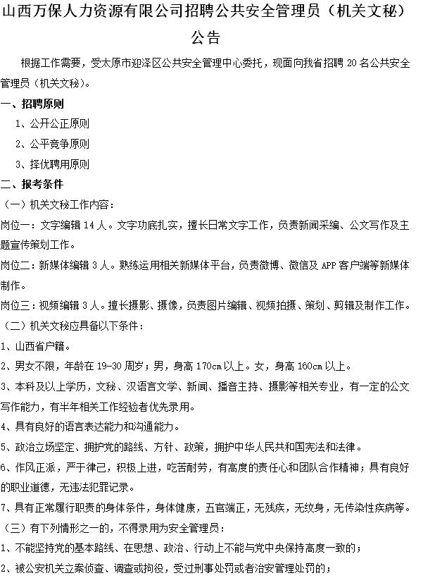 根據(jù)工作需要,經(jīng)古交市政府批準,現(xiàn)面向古交市公開招聘輔助工作人員30名。招聘工作由山西萬保人力...